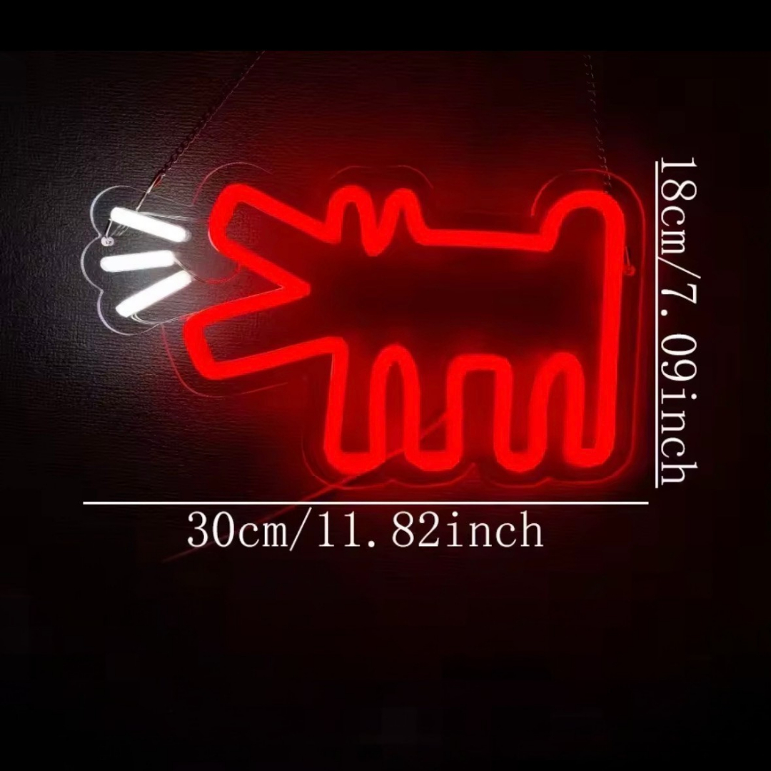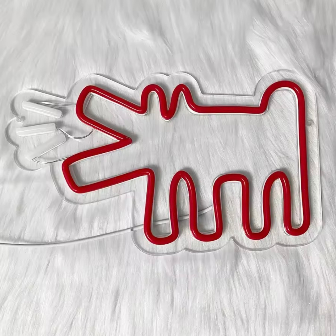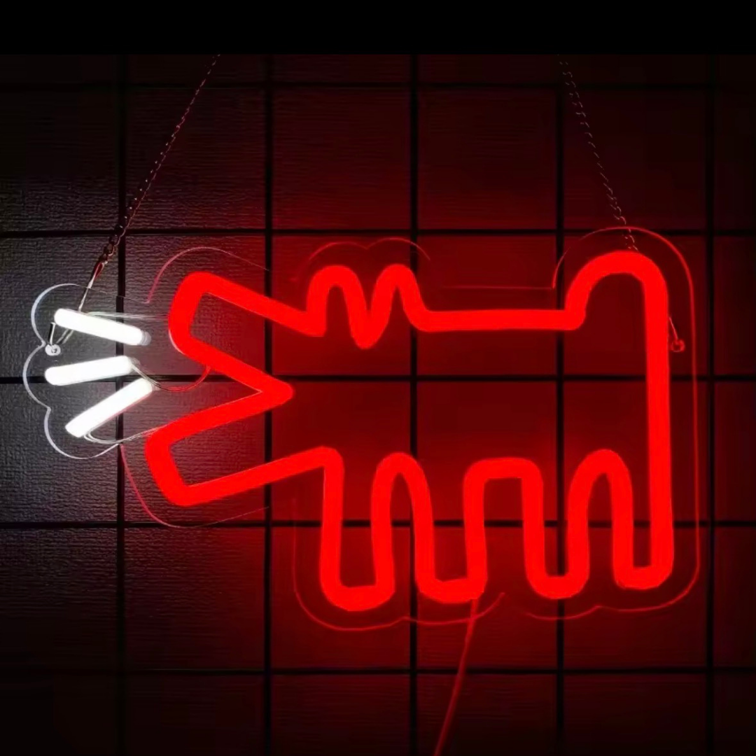 Un classique revisité de l’univers pop art, directement inspiré des œuvres de Keith Haring. Ce néon rouge éclatant, souligné d’un aboiement blanc lumineux, symbolise l’expression, la liberté et la créativité brute.