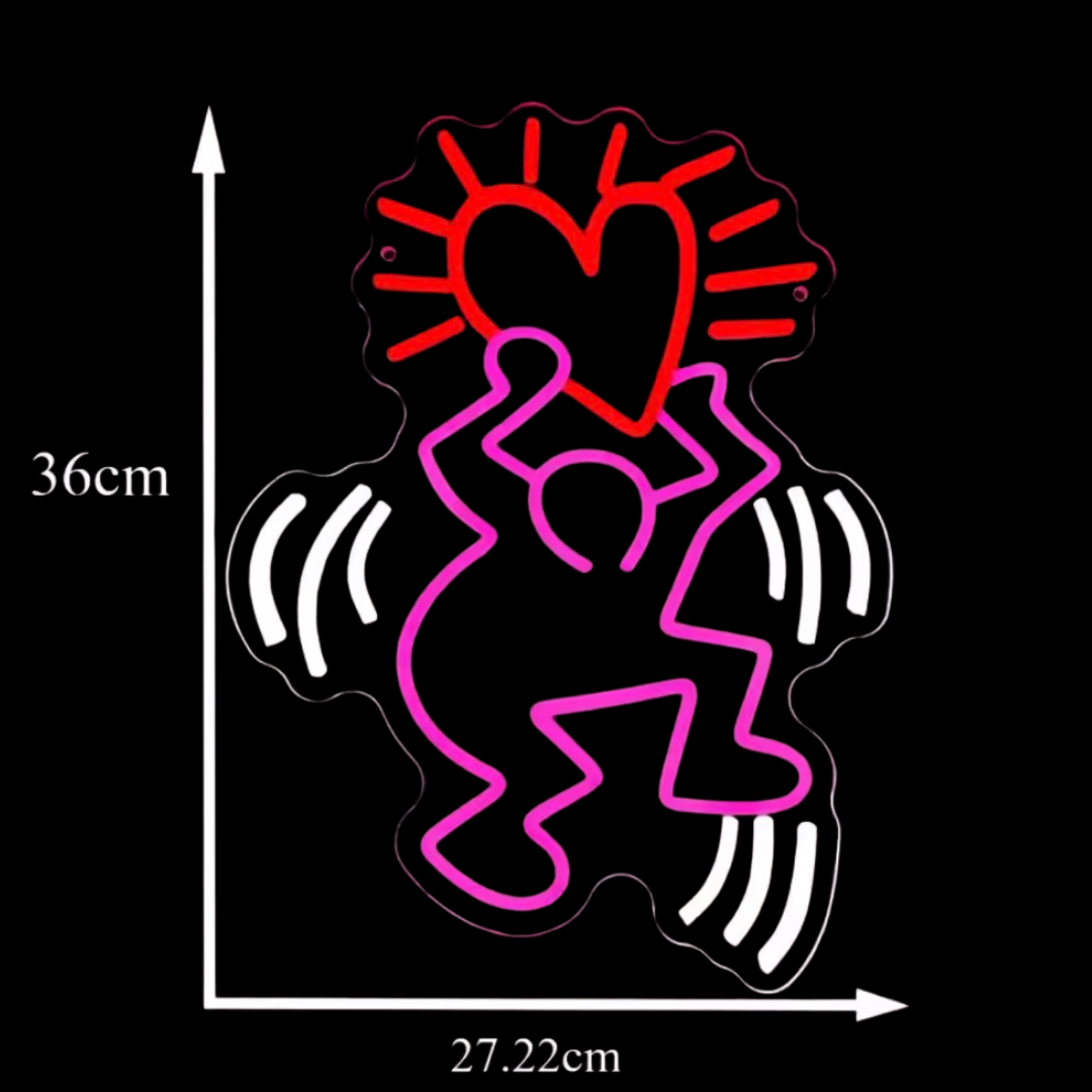 Un hommage lumineux à l’art pop et à la joie du mouvement, inspiré du style emblématique de Keith Haring. Ce néon vibrant mêle rose fuchsia, rouge passion et blanc éclatant pour exprimer l’amour, l’énergie et la liberté.